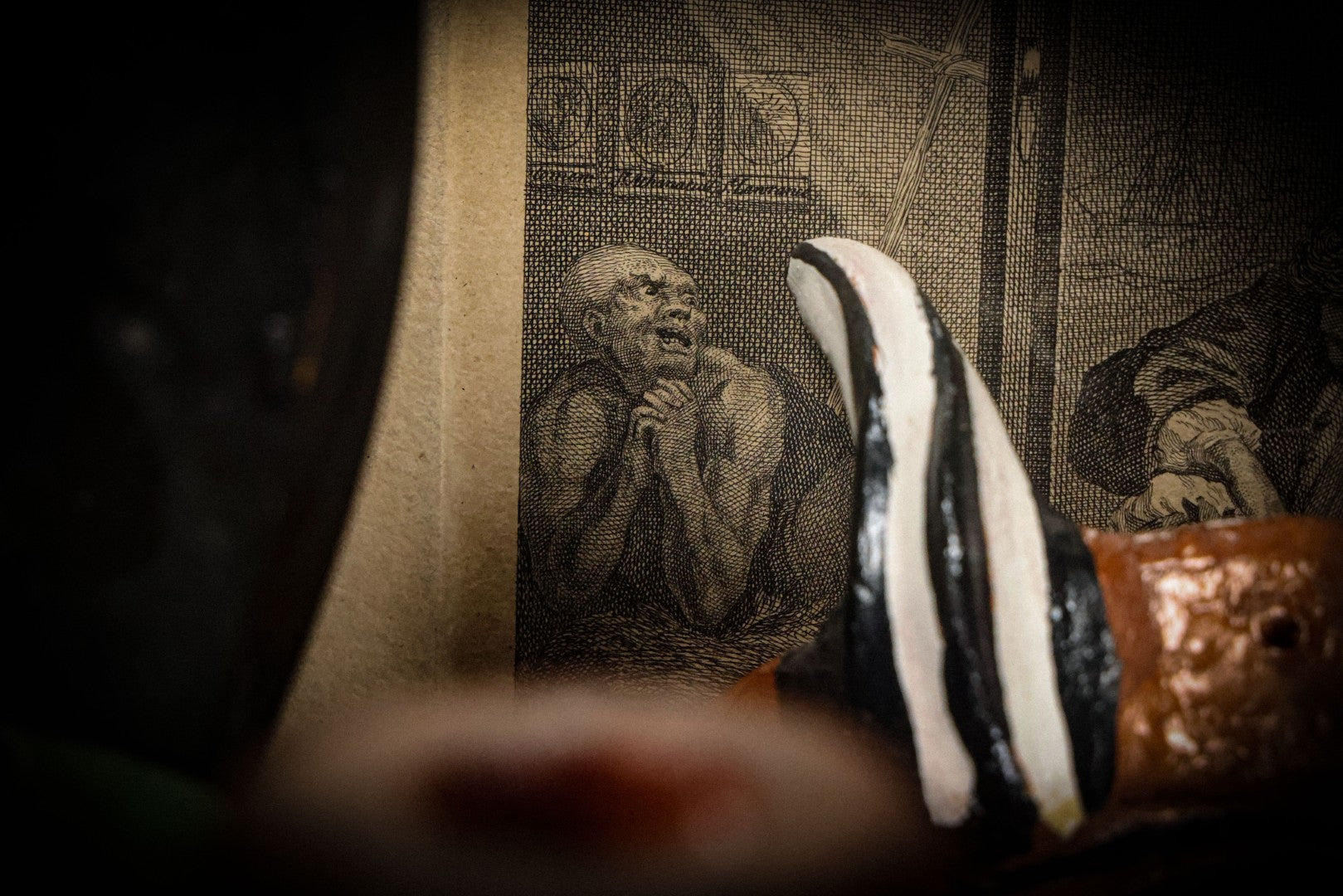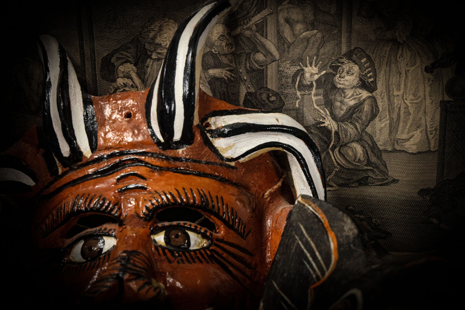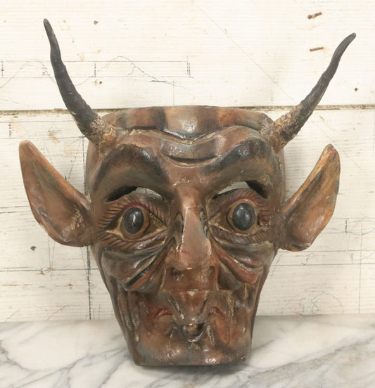 Sold For: Login to See Price Confirm BidLot 006 - Vintage Folk Art Devil Mask With Real Animal Horns And Whistling Mouth, Hand Carved W[...]