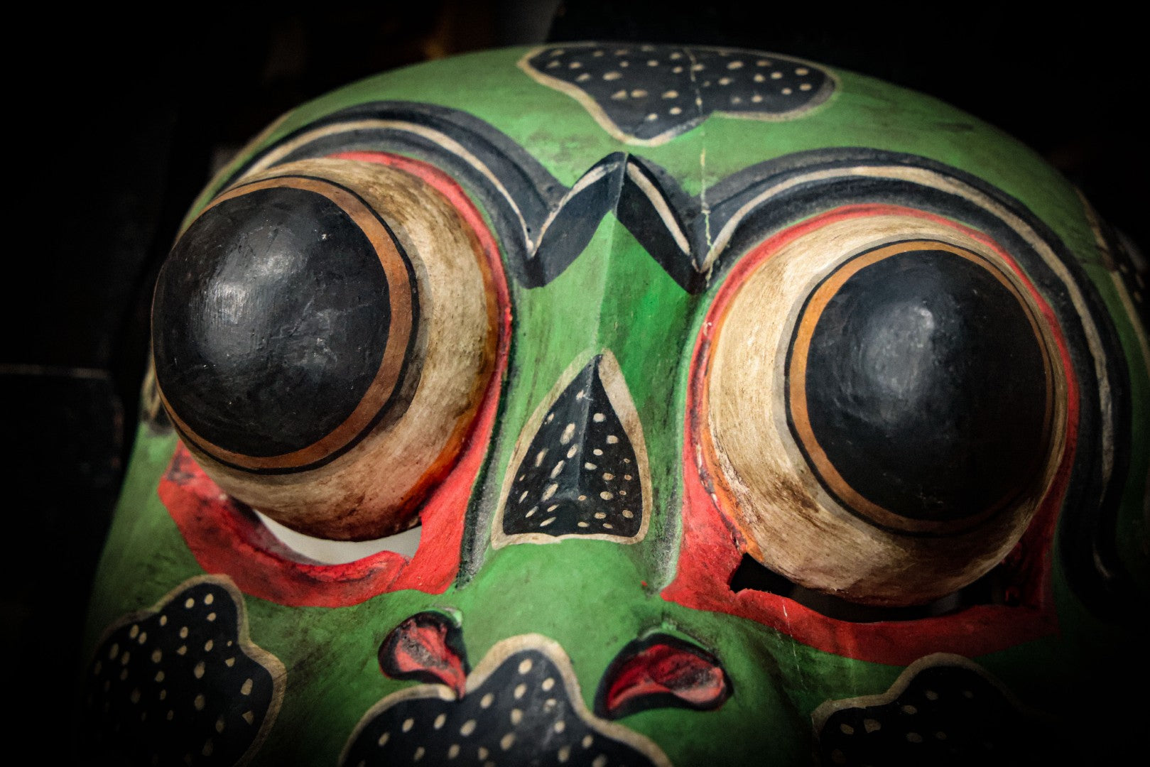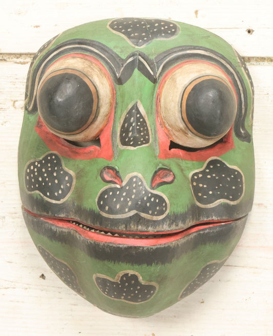 Lot 009 - Vintage Frog Mask With Bulging Eyes, Hinged Mouth, And Carved Teeth, Hand Carved Wood, Hand Painted, With Wire Hanger