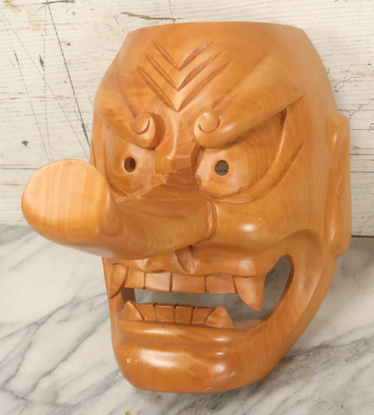 Lot 011 - Contemporary Japanese Hannya Mask With Comically Large Nose, Hand Carved Wood, Unpainted, With Rope Hanger