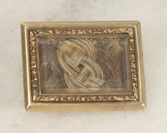 Lot 021 - Antique Victorian Human Hair Work Braided Brooch With Rectangular Beveled Glass Window And Pin Back, Blond And Brown Hair, Approximately 3/4" x 9/16"