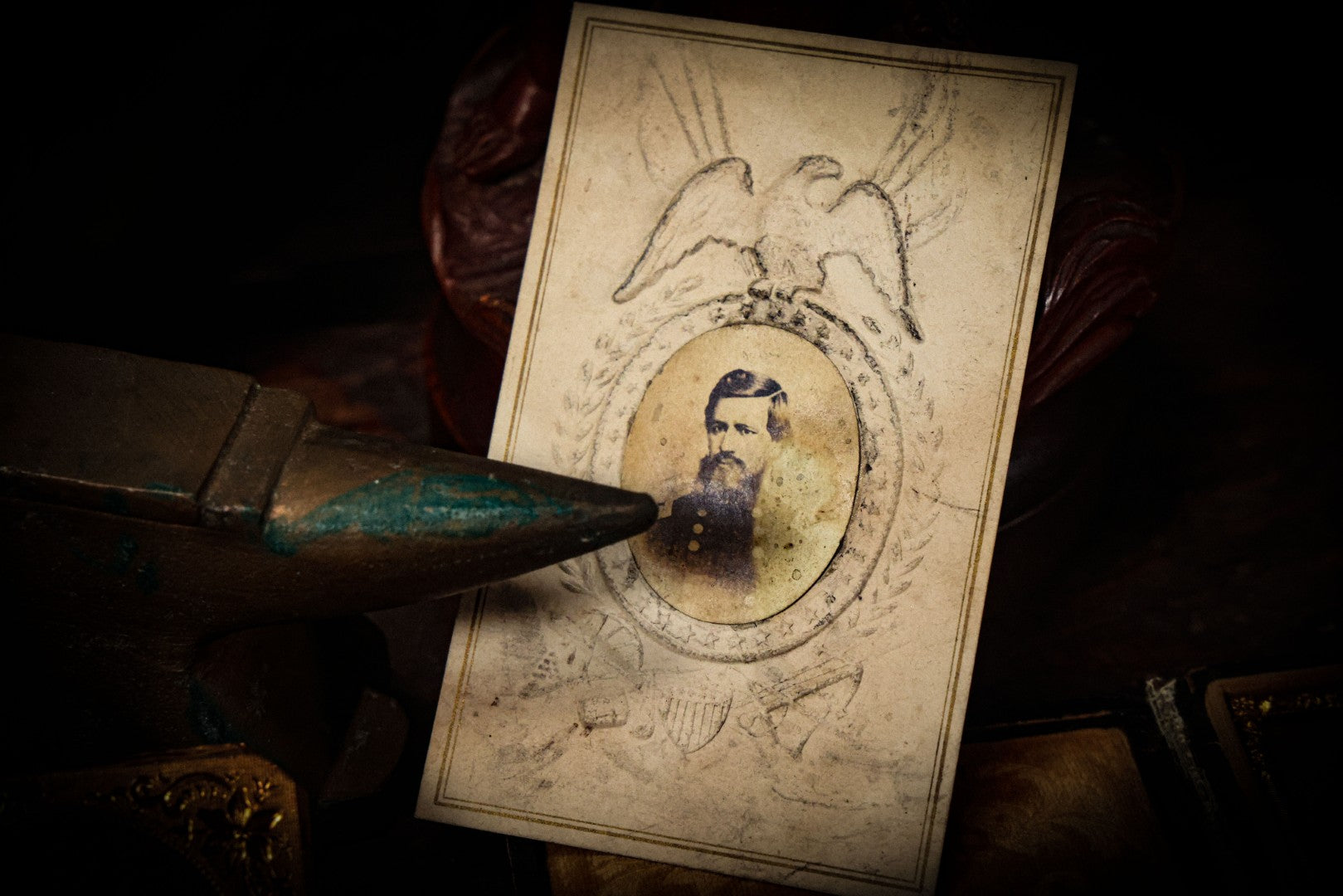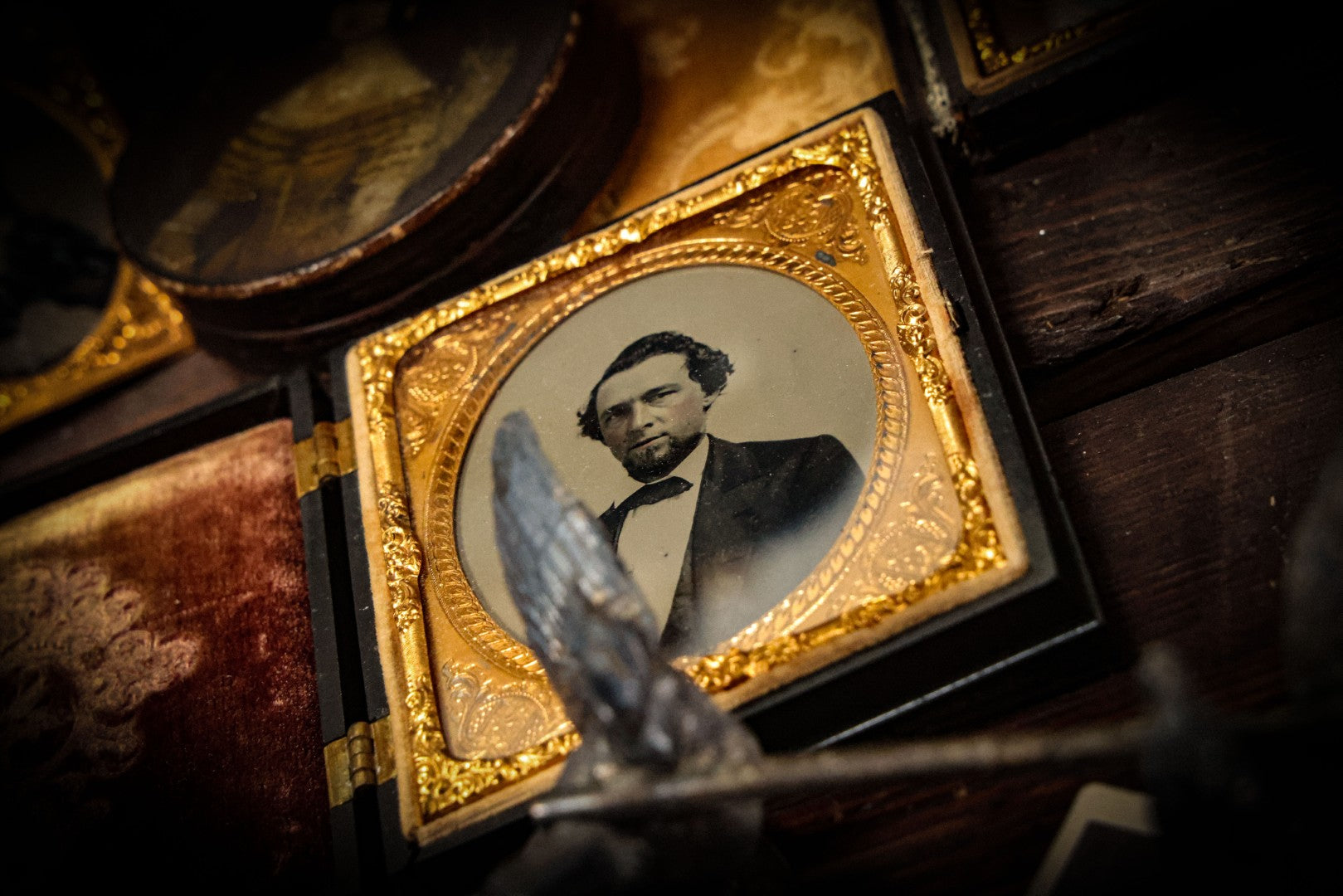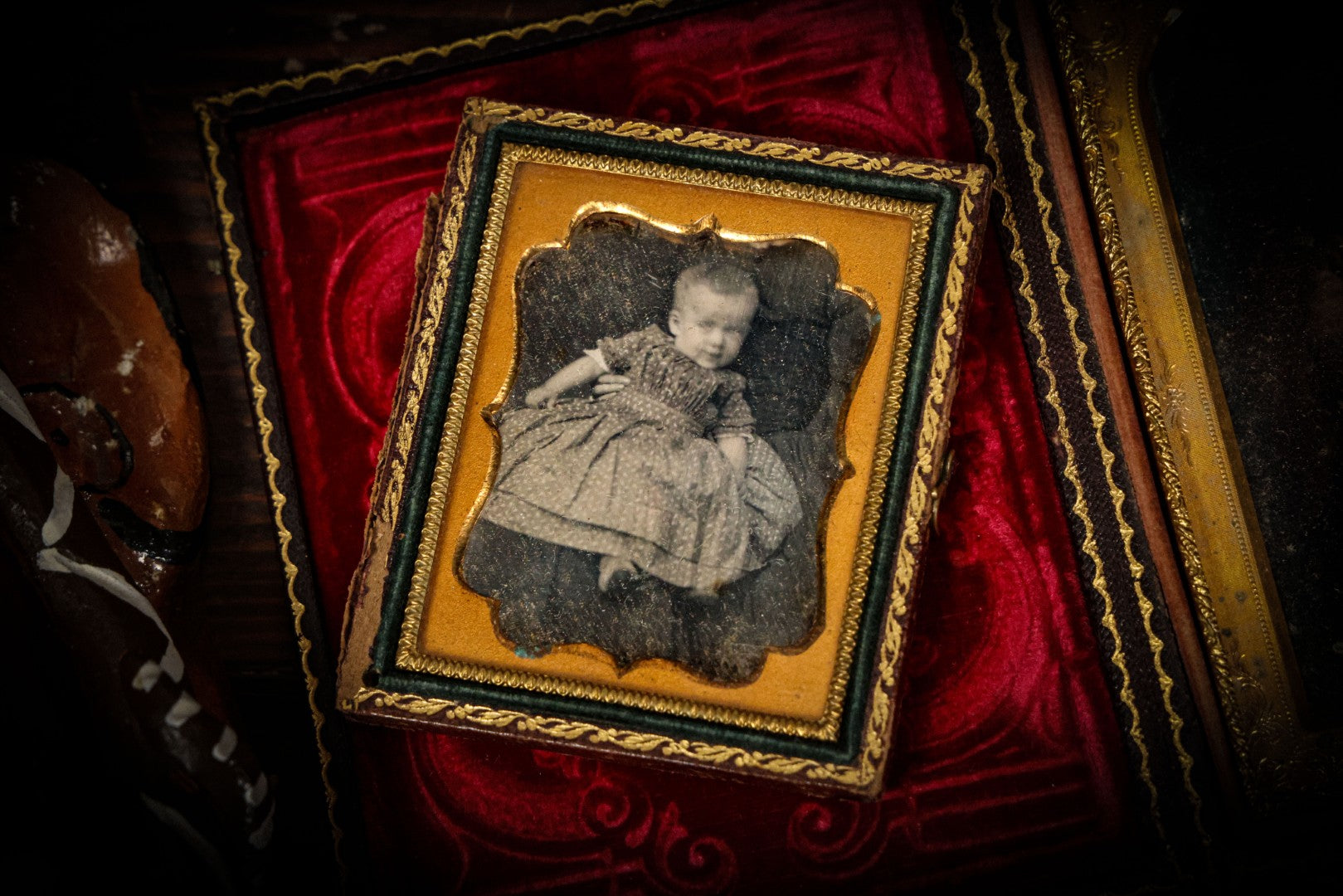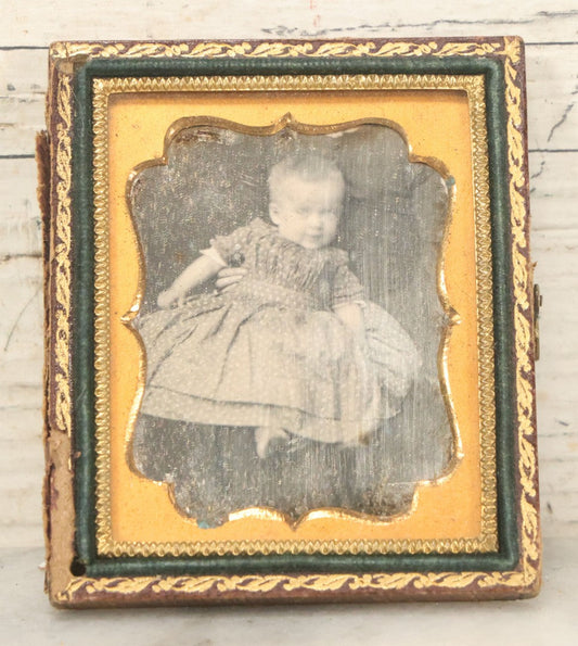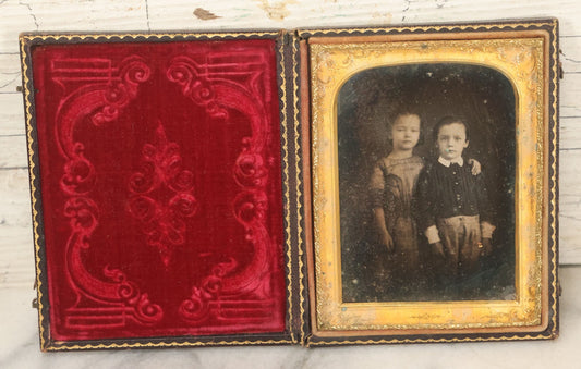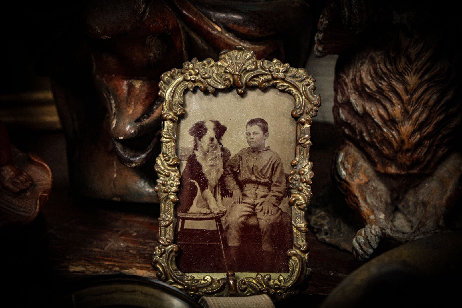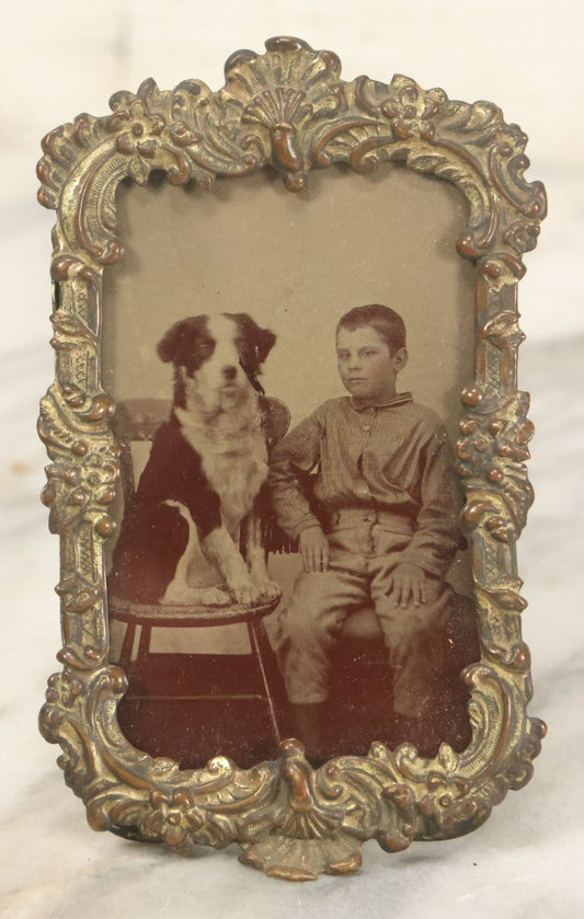 Lot 023 - Antique Tintype Photograph Of Young Boy And Border Collie Dog Seated On Chair, In Period Pressed Brass Ormolu Frame With Kickstand