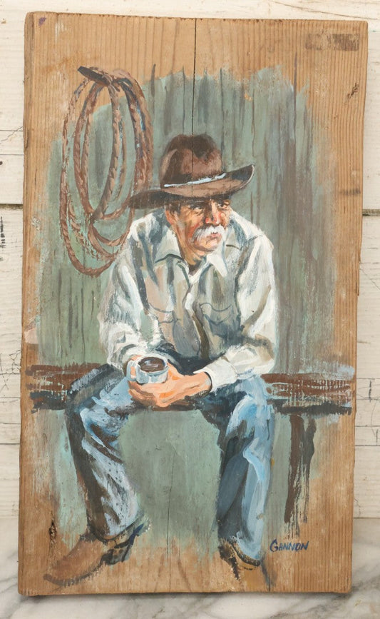 Lot 033 - Vintage Painting On Wood Panel Of Cowboy Drinking Coffee, Artist Signed Gannon, 8" x 13-1/2"