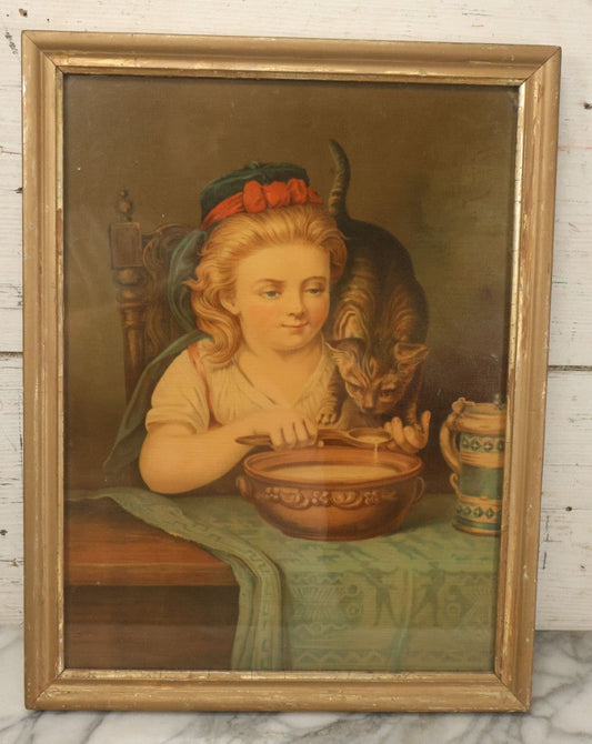 Lot 042 - Antique Chromolithograph Of Little Girl Sharing Soup With Kitten, In Gold Painted Frame, 13-5/8" x 17-5/8"