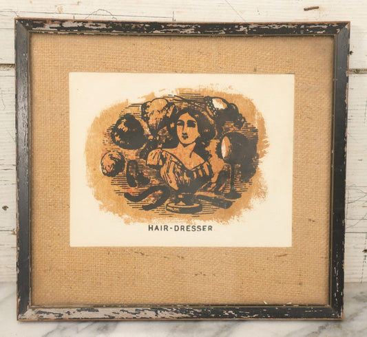 Lot 045 - Vintage Hairdresser Decorative Art Screen Printed On Faux Leather With Burlap Mat, In Frame, 11-3/4" x 10-5/8"