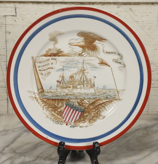 Lot 050 - Antique Transferware Porcelain Plate Commemorating The Us Battleship Maine, Destroyed In Havana Harbor, Cuba, 1898, "Remember The Maine", Hallmarked On Verso, 8-1/2" Diameter