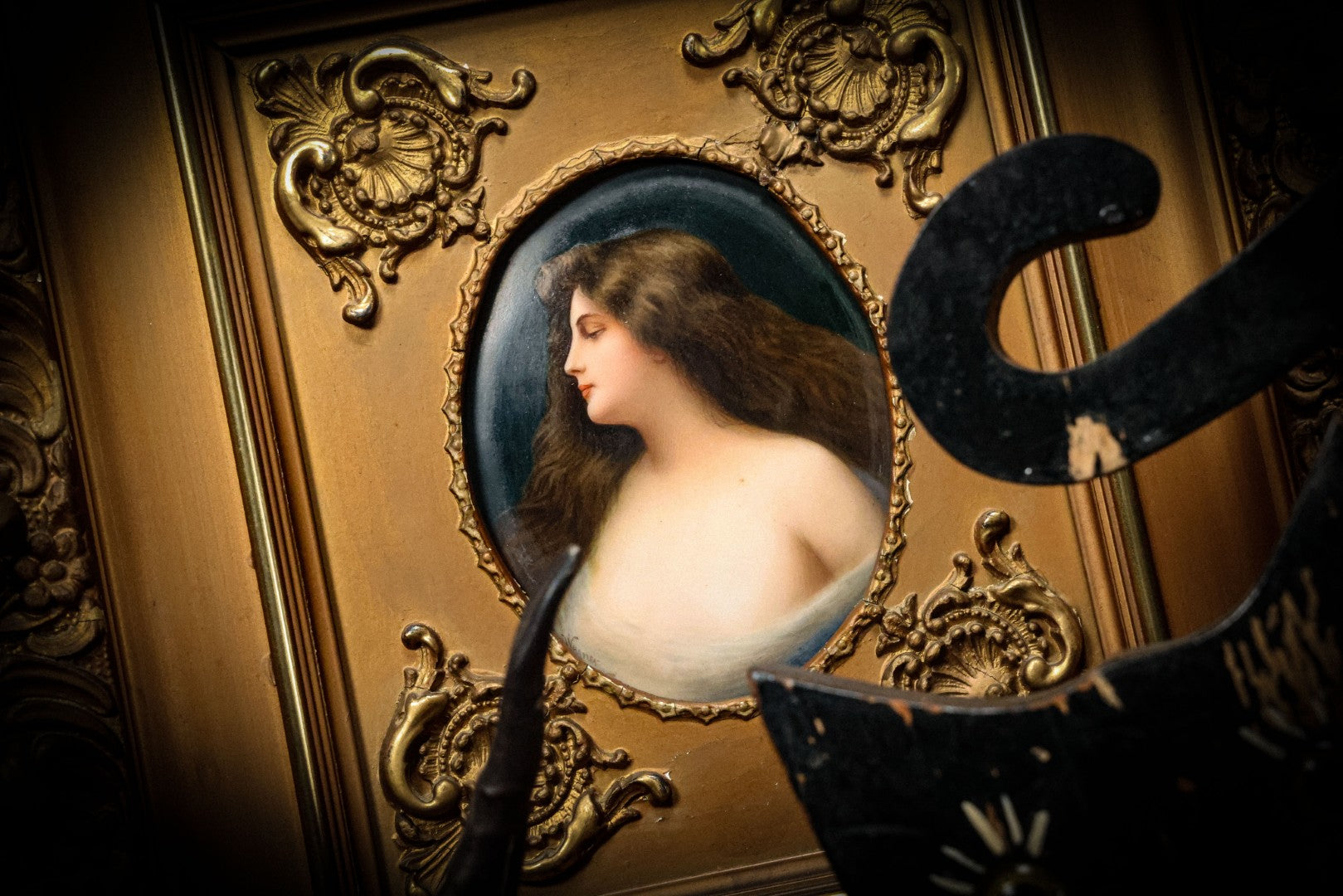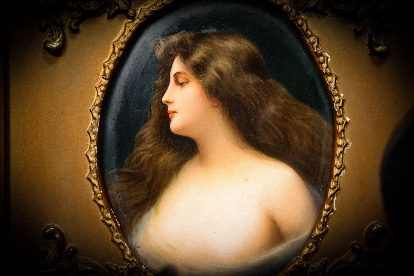 Sold For: Login to See Price Confirm BidLot 001 - Fine Antique Hand Painted Porcelain Tile Of Semi-Nude Woman In Ornate Gesso Frame, Ma[...]
