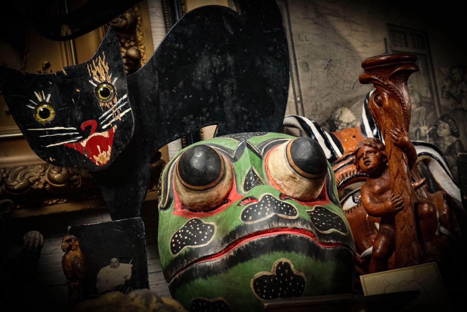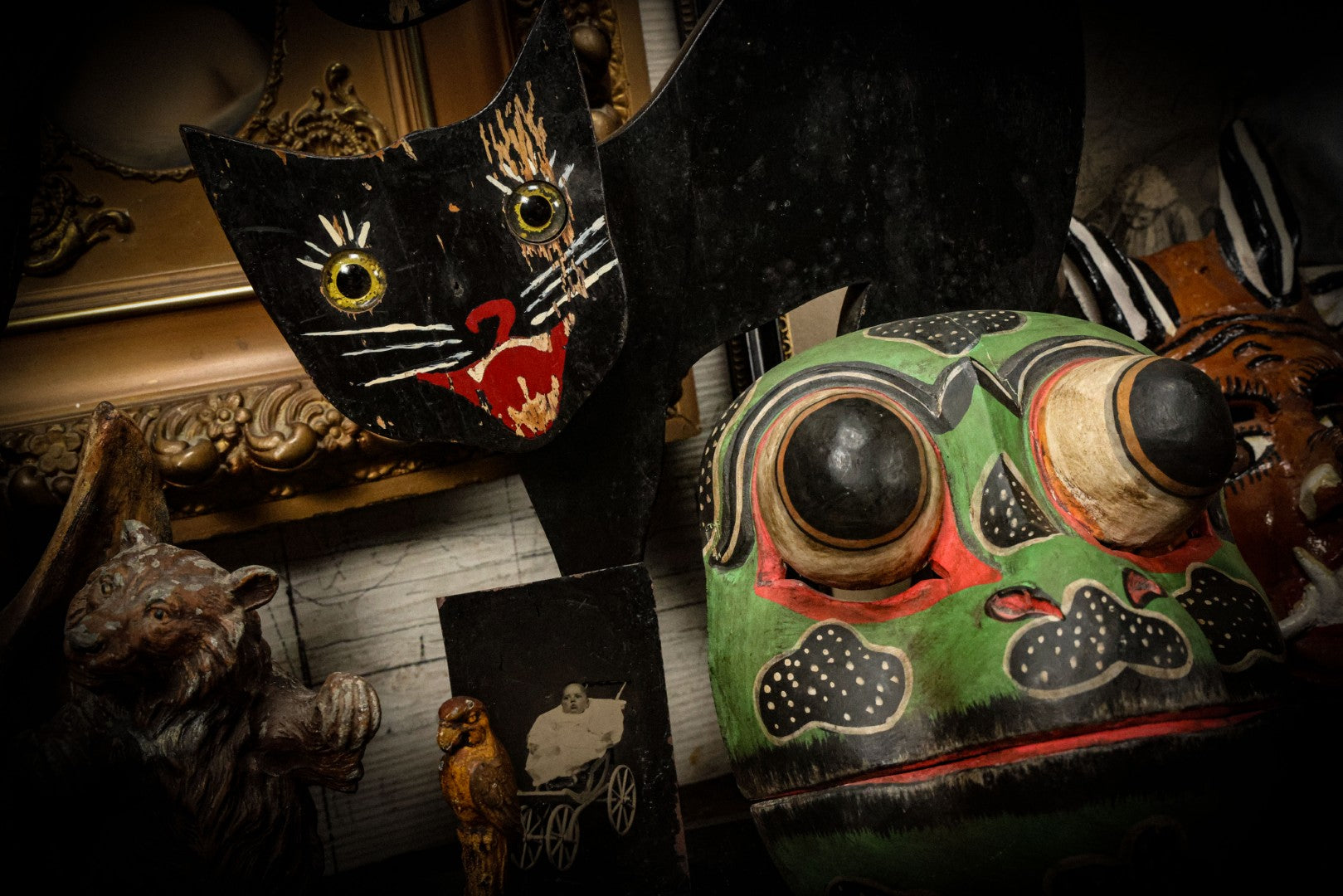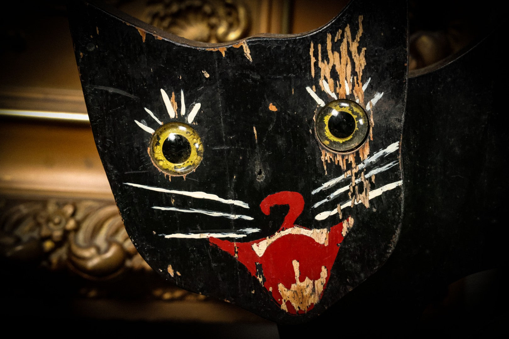 Sold For: Login to See Price Confirm BidLot 003 - Antique Folk Art Wood Cut Halloween Black Cat With Grinning Face, Yellow Glass Eyes, [...]