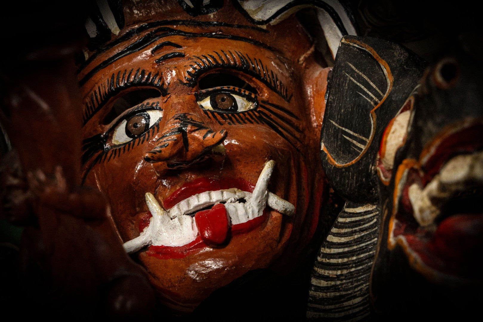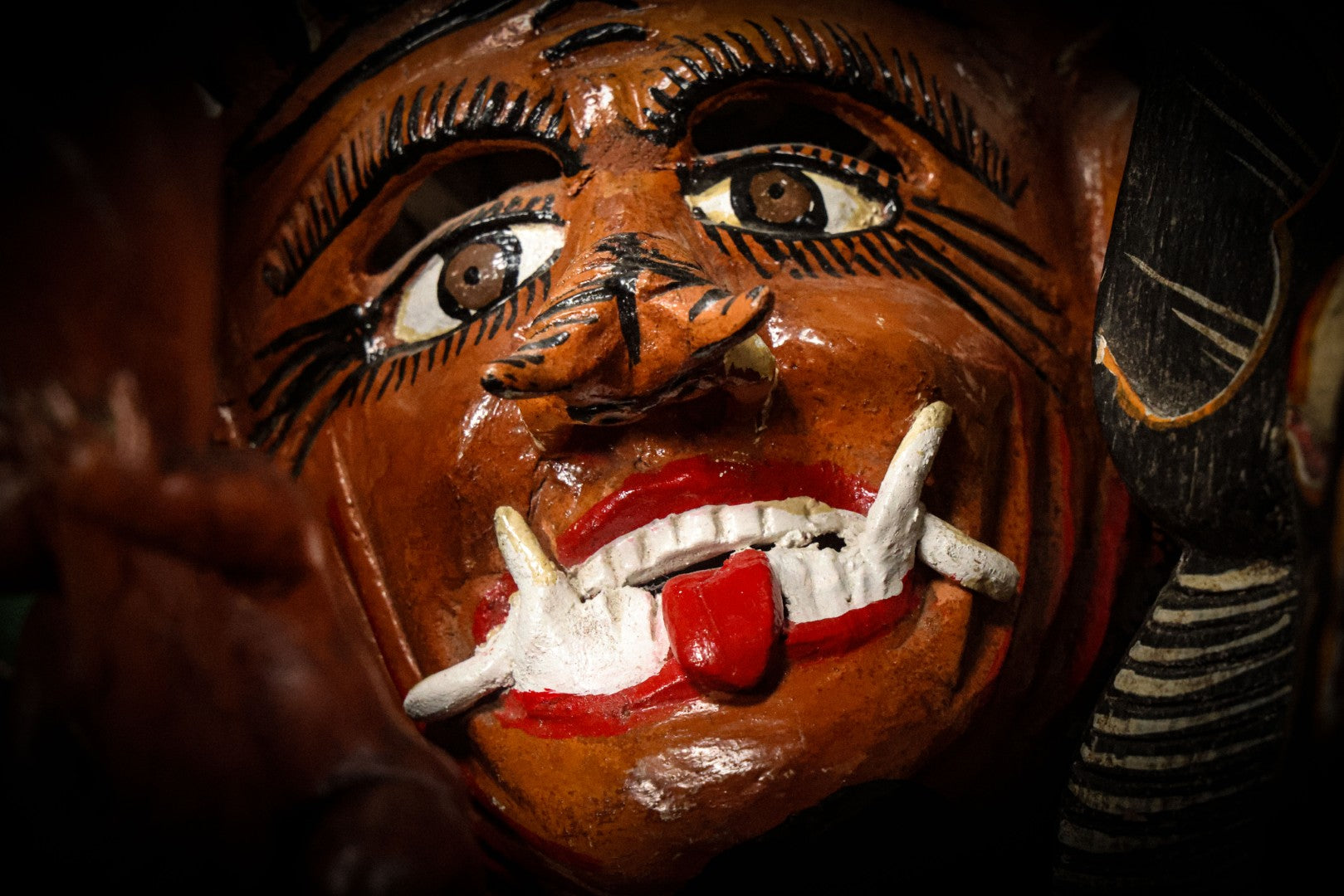 Lot 006 - Vintage Folk Art Devil Mask With Real Animal Horns And Whistling Mouth, Hand Carved Wood, Hand Painted, With Wire Hanger