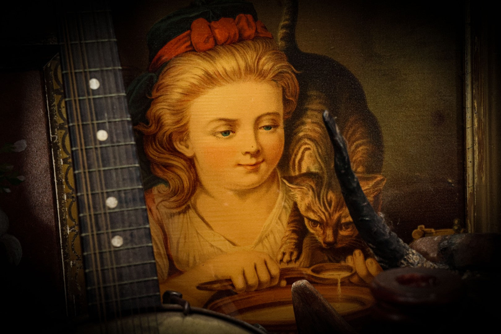 Sold For: Login to See Price Confirm BidLot 042 - Antique Chromolithograph Of Little Girl Sharing Soup With Kitten, In Gold Painted Fra[...]