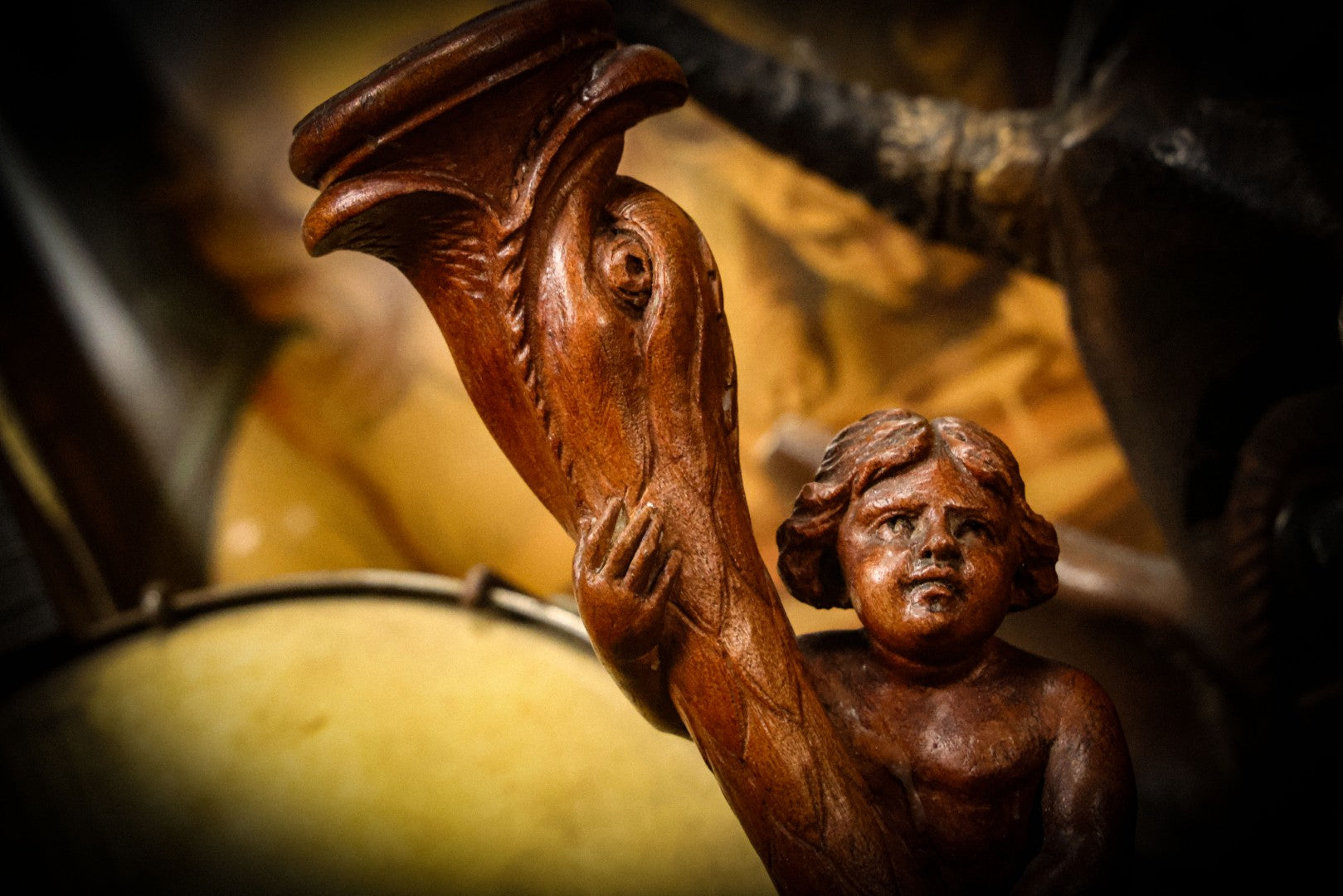 Lot 017 - Pair Of Antique Folk Art Carved Candlesticks With Cherub And Serpent Motif, 9-1/2" Height