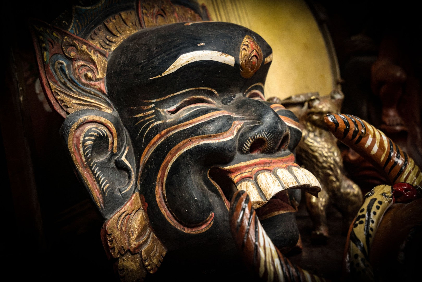 Lot 014 - Vintage Clay Devil Demon Mask With Striped Black And Gold Horns, Snakes Surrounding Face, Fangs, And Blue Nose, Hand Sculpted, Hand Painted, With Rope Hanger