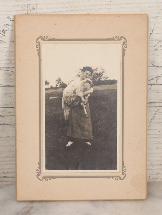 Lot 080 - Antique Boarded Photograph Of Woman Holding Fluffy Sheep On Farm
