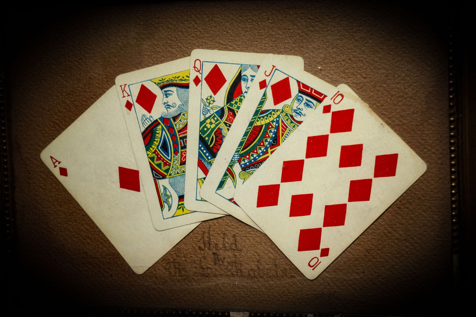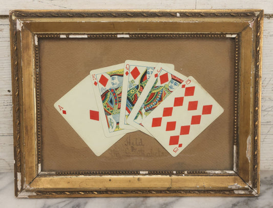 Lot 002 - Antique Royal Straight Flush Poker Card Hand In Frame, Commemorating A Hand Held By R. S. Roberts, Circa Early 20th Century, Original Frame, Note Water Damage And Wear, 12-1/4" x 9-1/4"