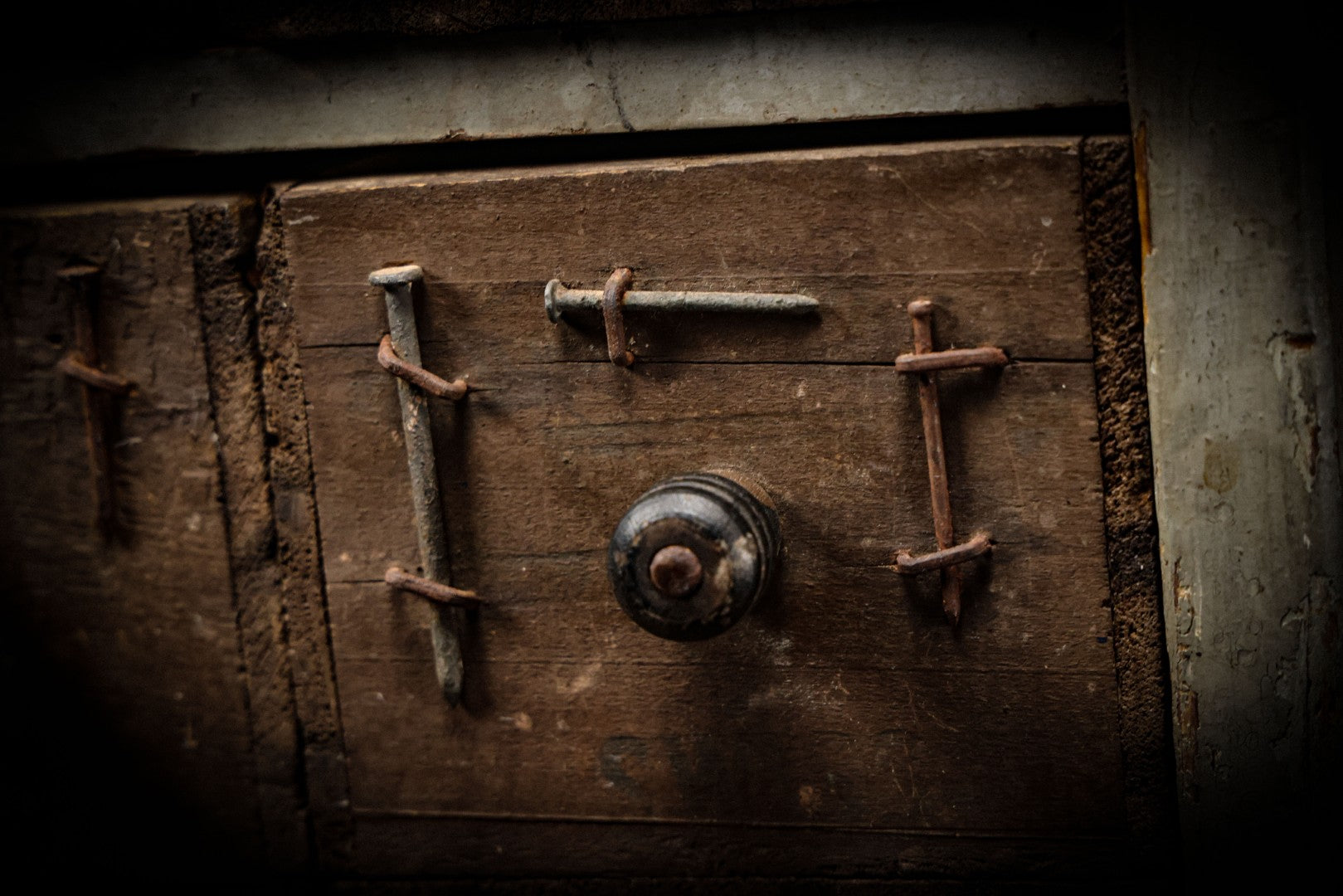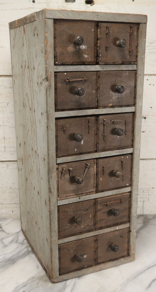 Lot 003 - Antique Make-Do 12-Drawer Nail And Hardware Bin With Drawers Made Out Of Old Cheese Boxes With Wooden Knobs, Many Drawers Divided, With Identifying Sample Nails Stapled To Front, Empty
