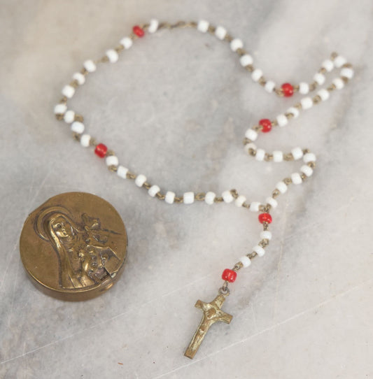 Lot 016 - Vintage Miniature White And Red Glass Rosary Beads With Crucifix In Button Sized Metal Carrying Case With Embossed Saint Therese