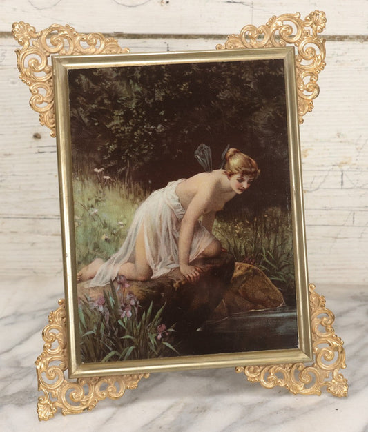 Lot 032 - Antique Lithographed Paper Board Box Cover Depicting Young Woman In Pink Dress Playing With Her Goldfish In Period Etched Wooden Frame, 10-5/8" x 11-3/4"