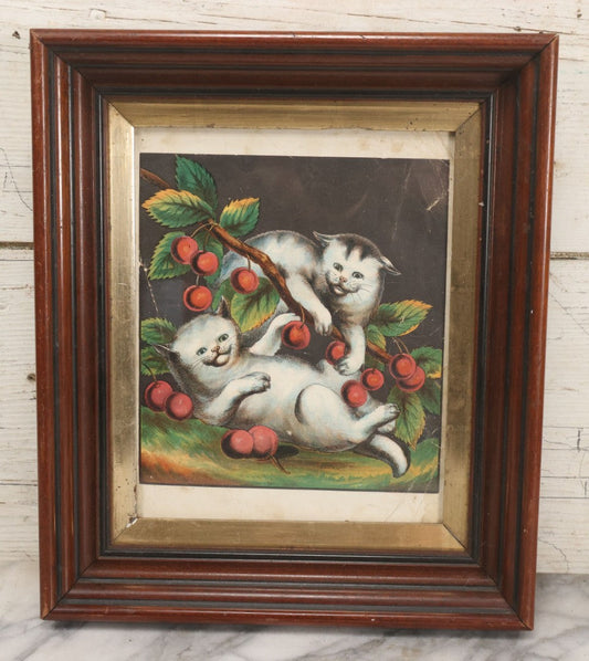 Lot 038 - Antique Chromolithograph Print Of Two Playful Cats In Cherry Tree In Deep Period Frame, 11-3/4" x 13-3/4"