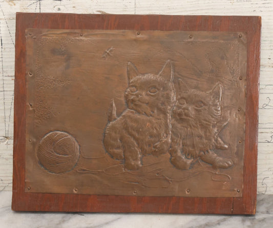 Lot 039 - Vintage Hammered Copper Cat Plaque Of Two Kittens Watching A Dragonfly, Mounted To Wood, 9" x 7-1/4"