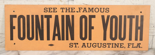 Lot 042 - Vintage Paper Board Travel Advertisement, "See The Famous Fountain Of Youth" St. Augustine, Florida, With Allied Printing Trades Council Union Bug Label, Note Six Perforated Mounting Holes, 22" x 7"