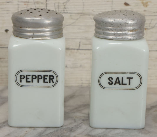 Lot 048 - Vintage Mid Century Milk Glass Salt And Pepper Shakers With Tin Lids And Black Lettering, 4-7/8" Height Each