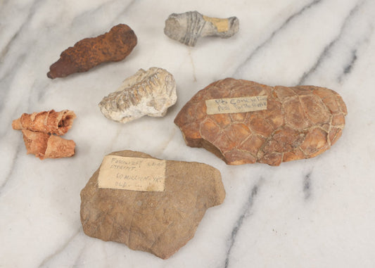 Lot 052 - Fossil Grouping With 5+ Specimens Including Coral, Fossilized Leaf Imprint, And Possible Turtle Flipper, Other Fragments, With Typewritten Notations, Found In Colorado, Alabama, And Elsewhere