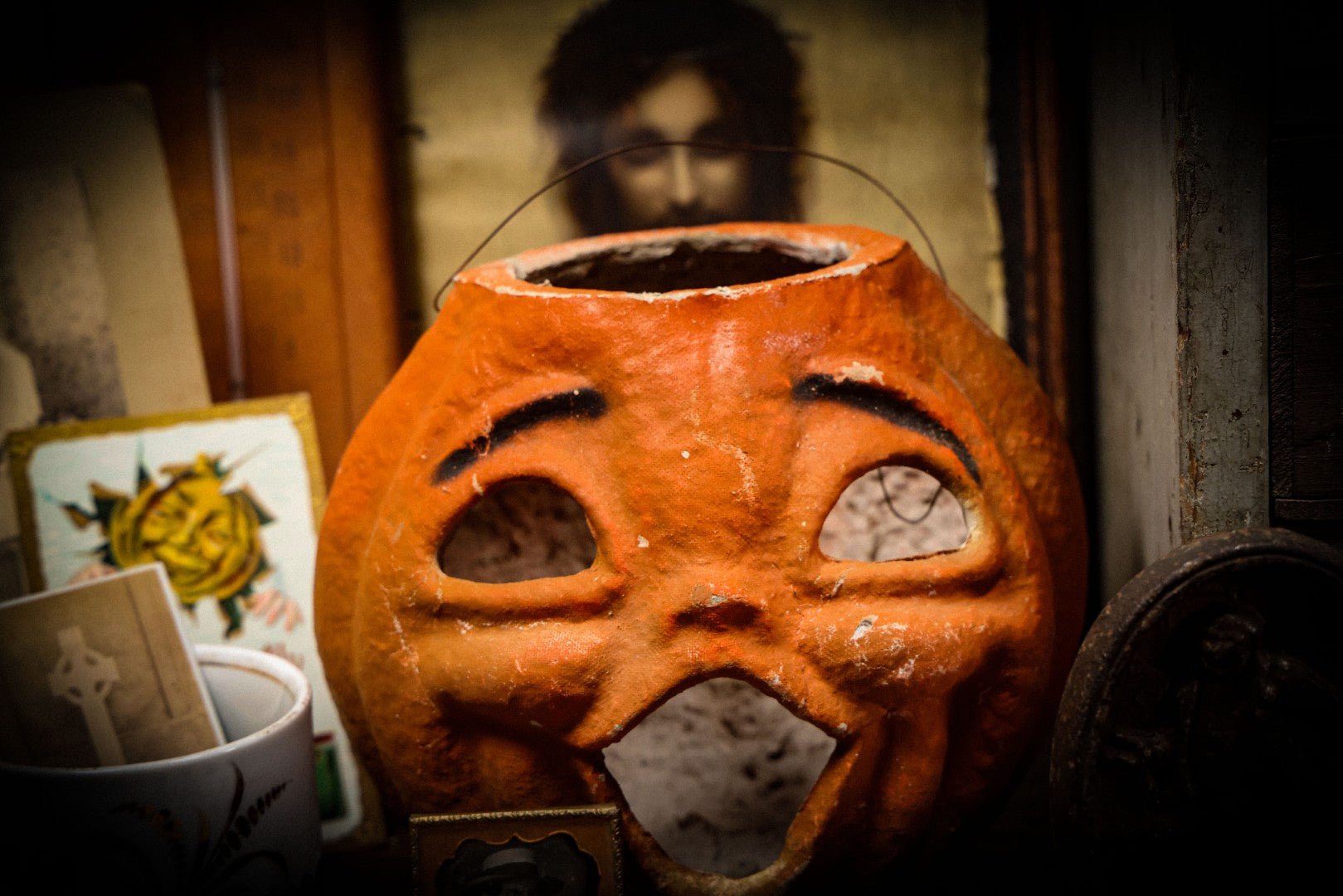 Lot 004 - Vintage Paper Pulp Halloween Jack-O-Lantern J.O.L. Choir Boy Candy Bucket Large Size 7-1/4" Height, Missing Face Insert