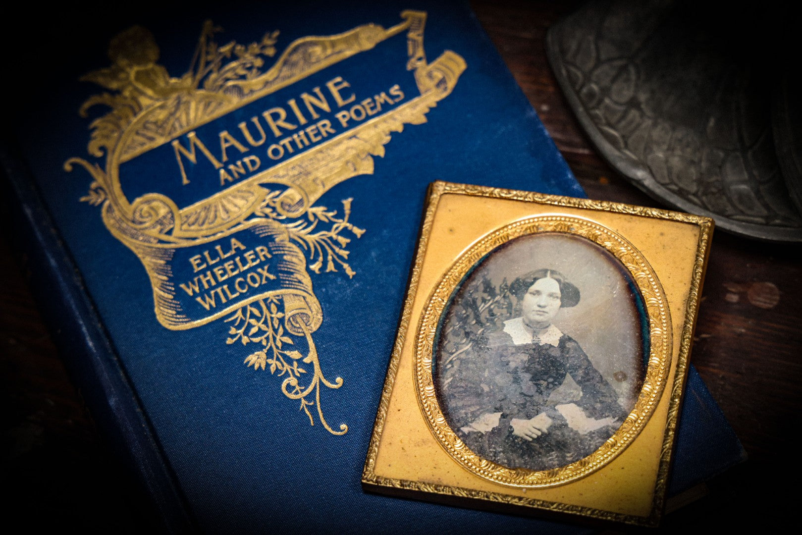 Lot 065 - Antique 1/6th Plate Daguerreotype Photograph Of Woman Wearing Gold Tinted Jewelry Sitting Beside Table With Book, No Case.