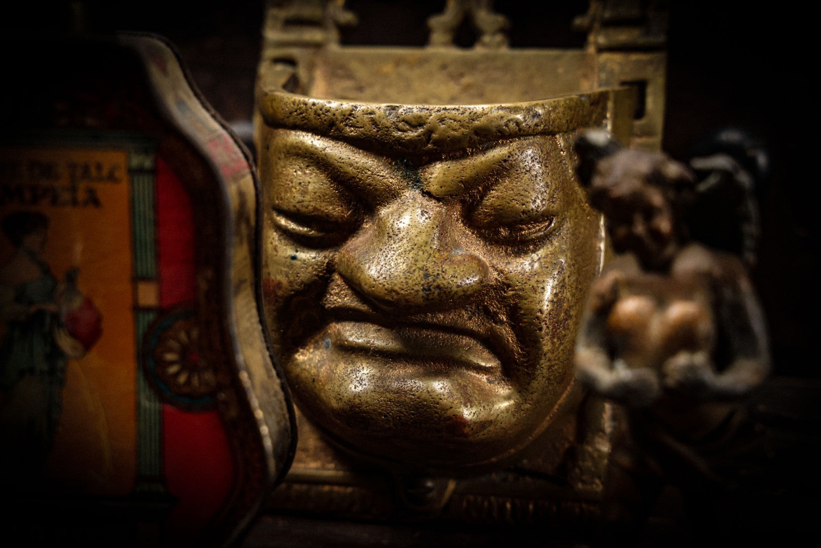 Sold For: Login to See Price Confirm BidLot 009 - Antique Gold Painted Cast Metal Gothic Monk Face Wall-Hanging Match Safe