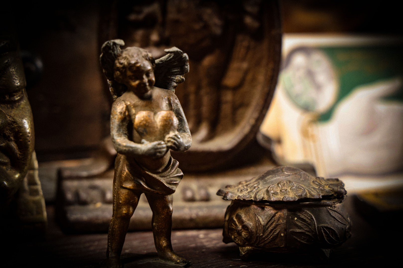 Lot 021 - Antique Pot Metal Valentines Cupid Figurine With Wings, Holding Heart, With Original Gold Paint