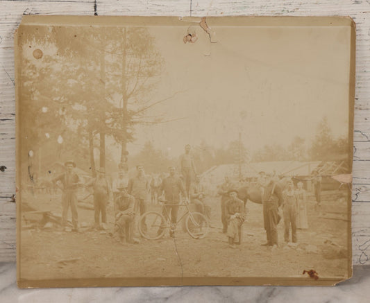 Lot 068 - Antique Boarded Occupational Photograph Of Group Of Lumber Workers Posing At A Lumber Camp In Mifflin County, Pennsylvania, Partial Identification On Verso Of "Grandpa Hoff", Bicycle And Horse In Photo, Note Cracking And Wear