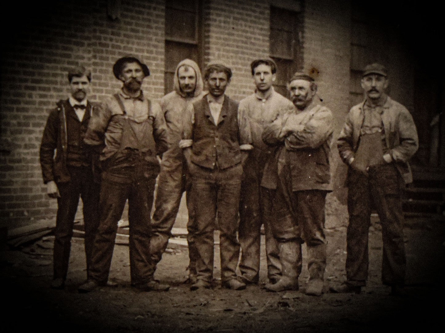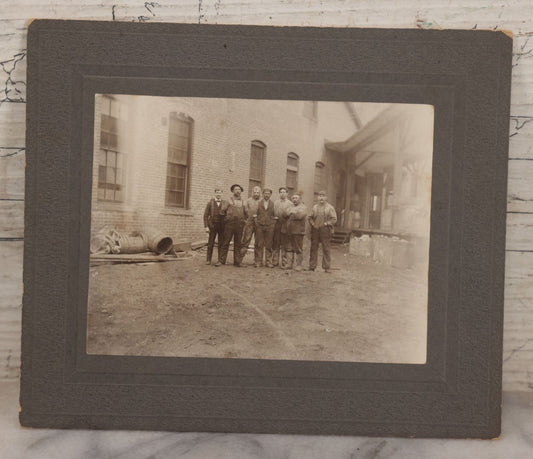 Lot 071 - Antique Boarded Occupational Photograph Of Group Of Seven Dirty Workers Posing In Work Clothes Outside Brick Workplace