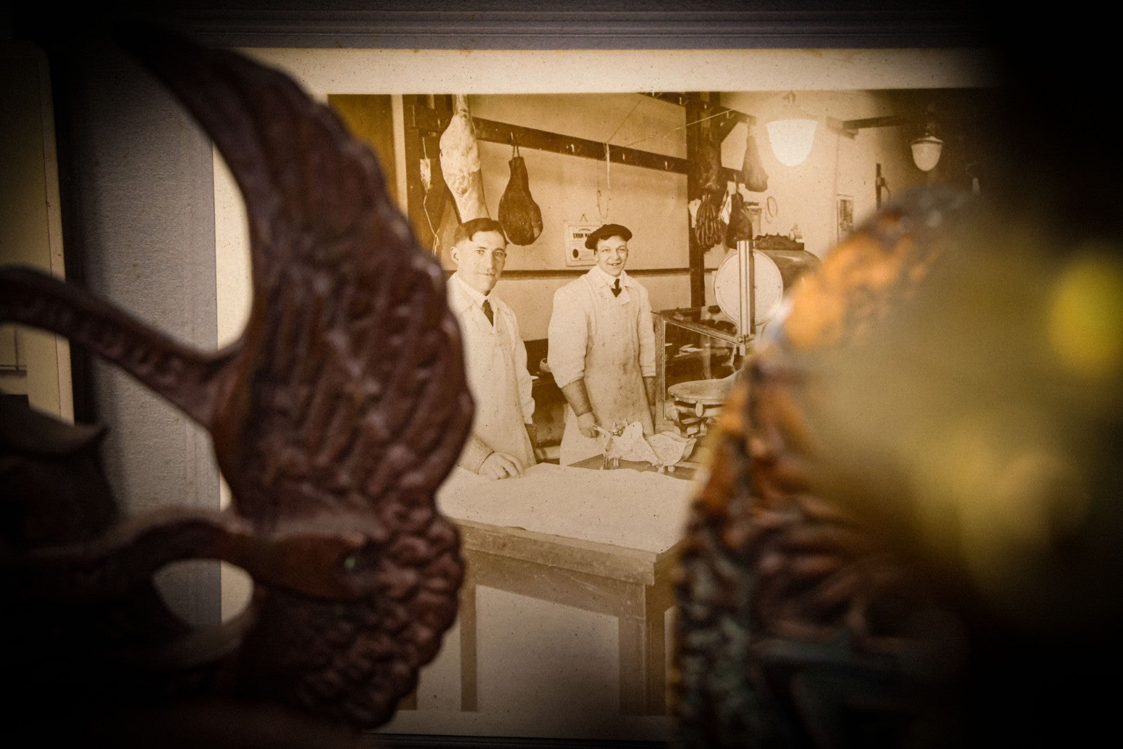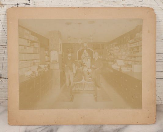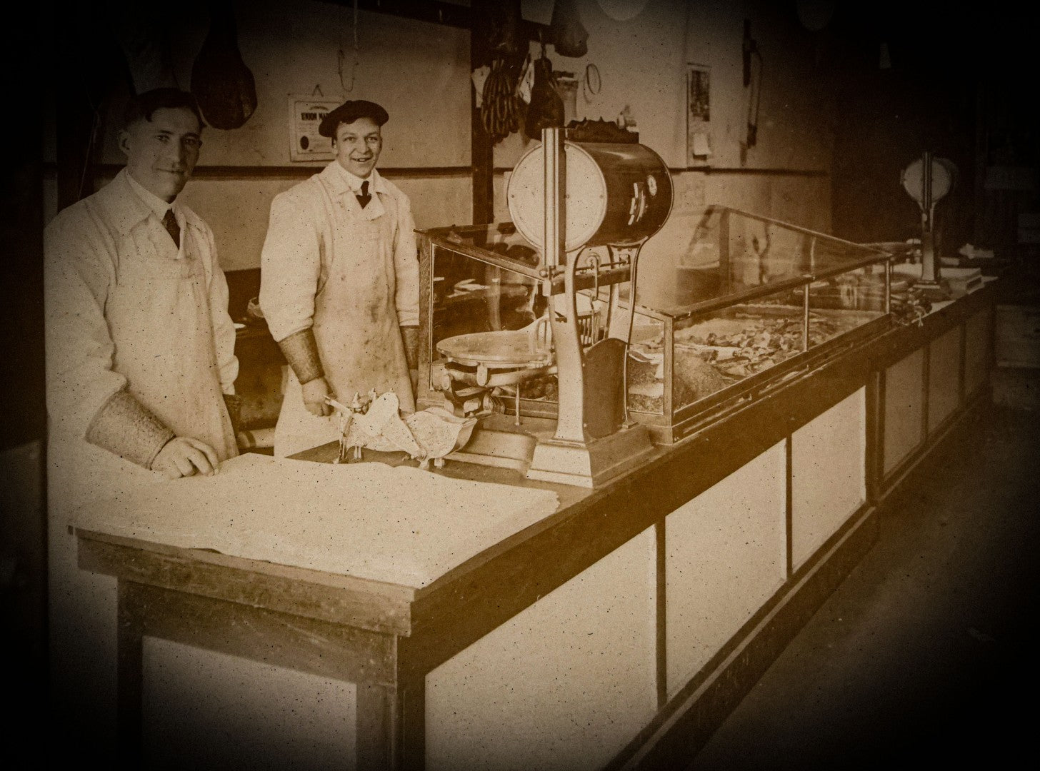 Lot 077 - Antique Boarded Occupational Photograph Of Two Butchers Behind Counter, With Sausage, Full Pig, And Other Meat Products Visible In Photo, And Large Commercial Scale
