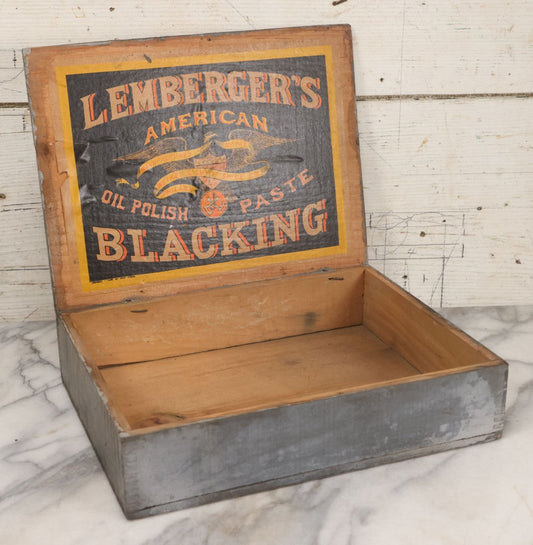 Lot 007 - Antique Wooden Advertising Display Box With Lithographed Interior Label For Lemberger's Blacking, American Oil Paste, Manufactured By The Weikel & Smith Spice Co., Philadelphia, With Eagle Motif