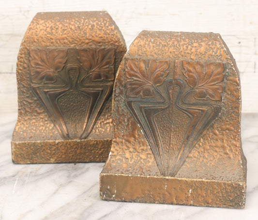 Lot 017 - Pair Of Antique Art And Crafts Art Nouveau Plaster Bookends With Leaf Design, Patinated Bronze Paint And Felt Bottom And Backing