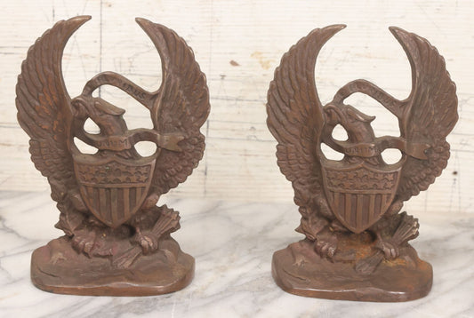 Lot 023 - Pair Of Vintage Bronzed Cast Iron Bookends With Patriotic Eagle Clutching Olive Branch And Arrows, With Shield And "E. Pluribus Unum" Banner