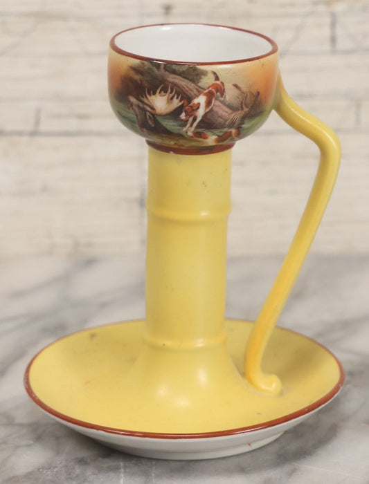 Lot 038 - Antique Yellow Painted Candlestick With Hunting Dogs Attacking Swimming Moose Motif, Manufactured By Royal Bayreuth, Bavaria, 5-3/8" Height