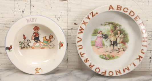 Lot 039 - Pair Of Antique Children's Plate Bowls Including Alphabet Dish With Children Riding Dog And Baby Dish With Child Playing With Toys, Marked Made In Czecho-Slovakia