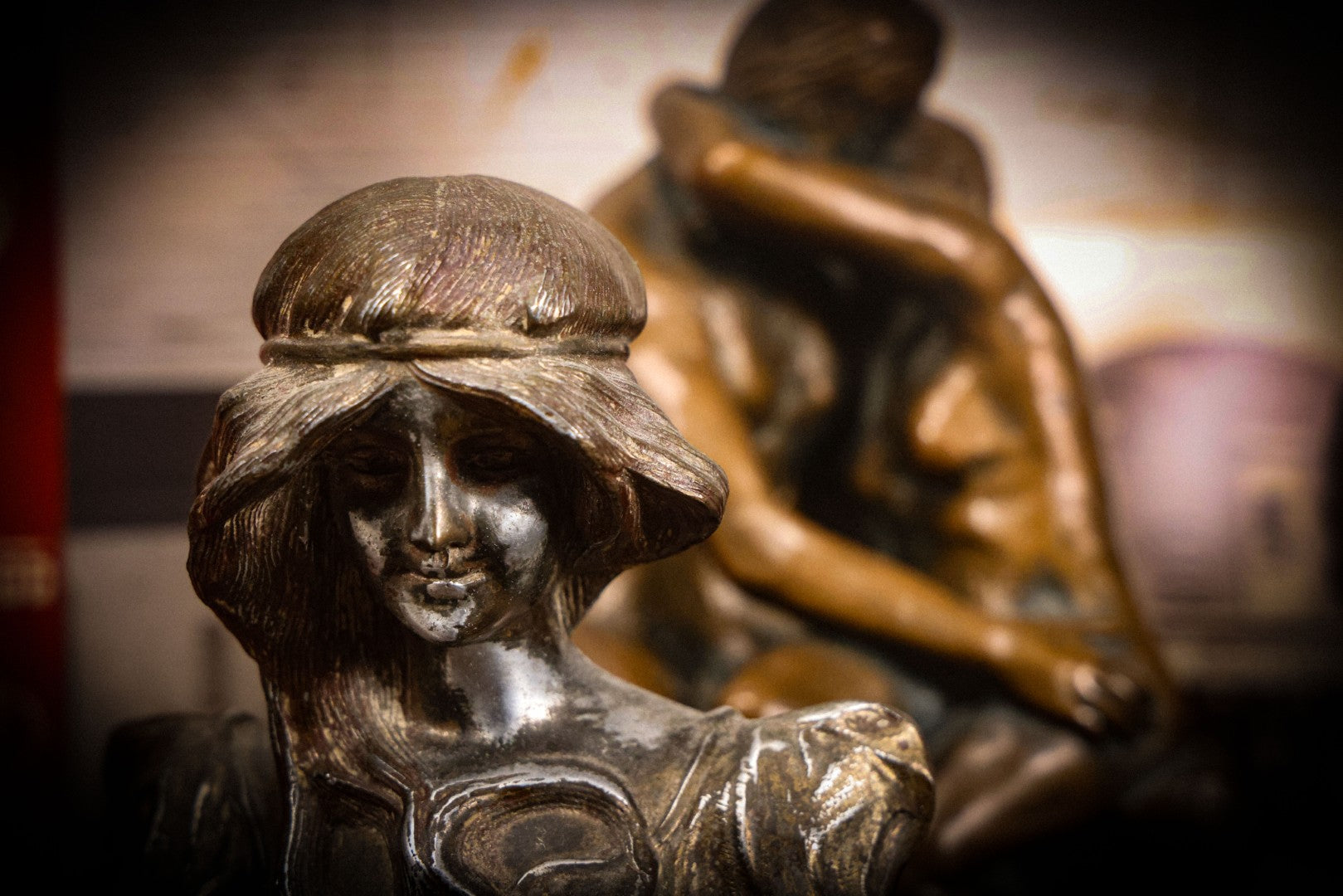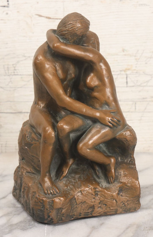 Lot 042 - Vintage Bronze Chalkware Status Of Nude Man And Woman In Lovers Embrace After "The Kiss" By Auguste Rodin, Manufactured By Q.A.C. Finelli, Copyright 1964, 8-1/4" Height