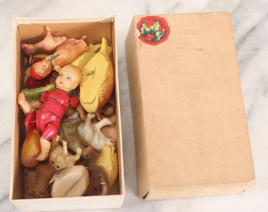 Lot 058 - Box Lot Grouping Of 19 Vintage Celluloid Dolls And Animal Toys Including Hippo, Elephant, Polar Bear, Camel, Donkey, Fish, And More