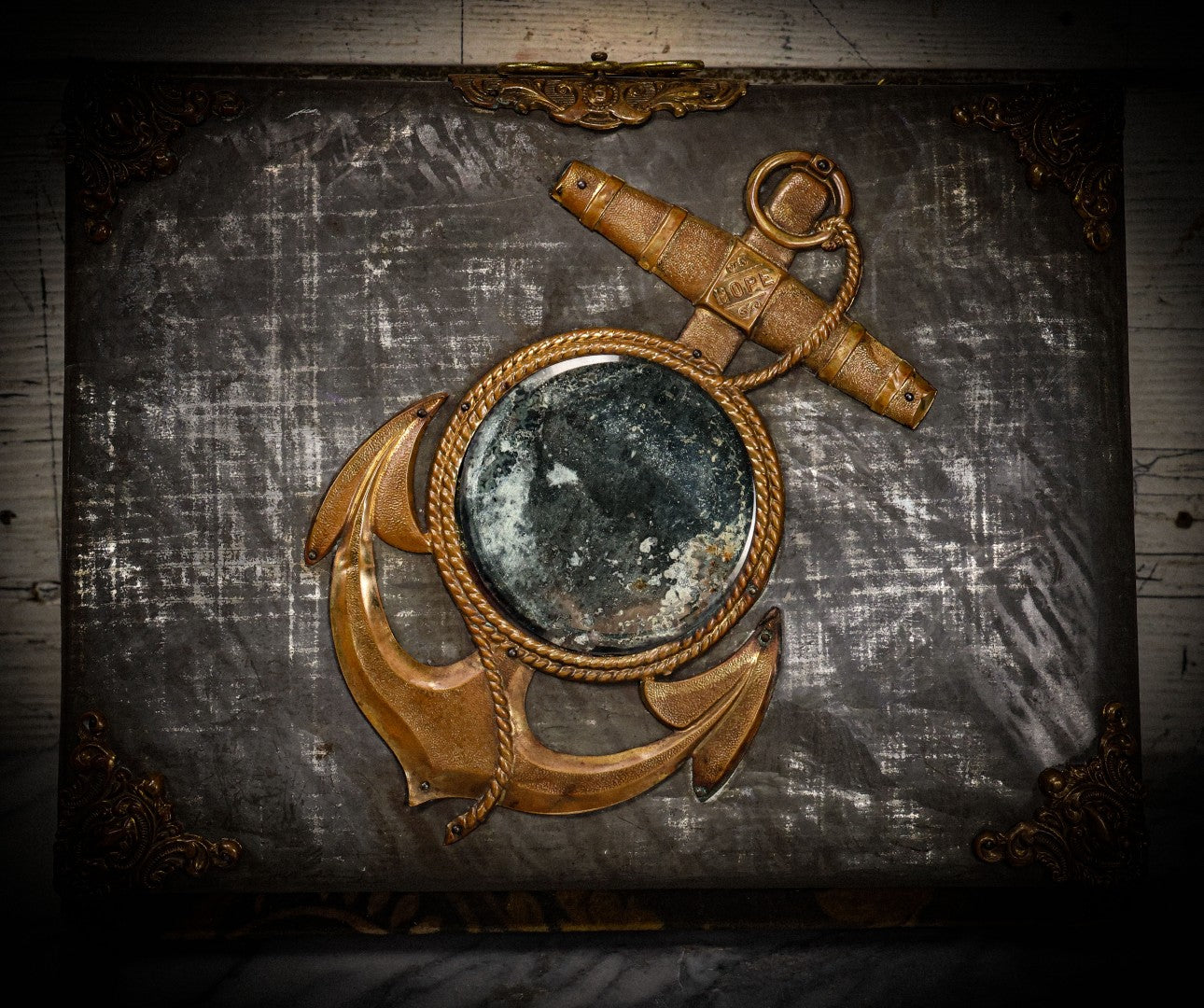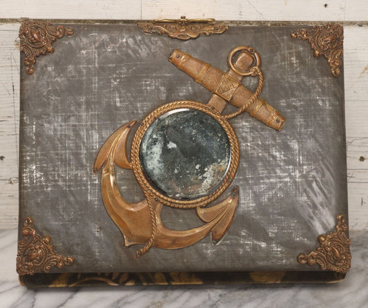 Lot 061 - Antique Victorian Photo Album With Tin Cover And Pressed Brass Anchor "Hope" Motif With Worn Beveled Glass Mirror, And Green Velvet Backing Containing 40+ Cabinet Card And Other Photographs