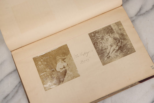 Lot 064 - Antique Snapshot Photo Album Scrapbook Contained In A Record Ledger With 40+ Photos And Scraps, With Handwritten Enscriptions, Including Interior Photos, Outdoor Photos, And More, Circa 1900, Hand Drawn Flower Scraps