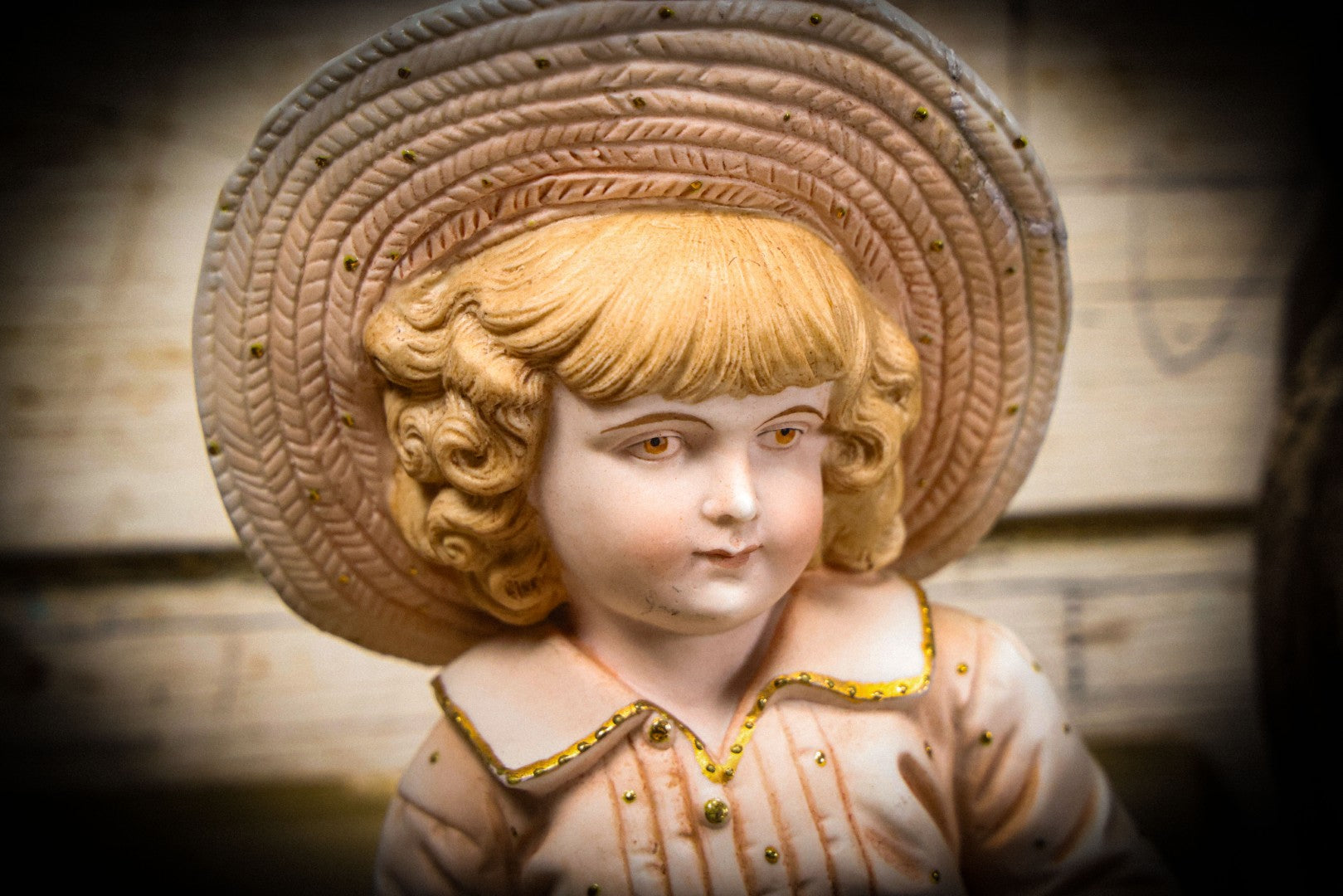 Sold For: Login to See Price Confirm BidLot 037 - Vintage Bisque Statue Of Young Blond Child In Large Straw Hat Sitting By Shore With P[...]