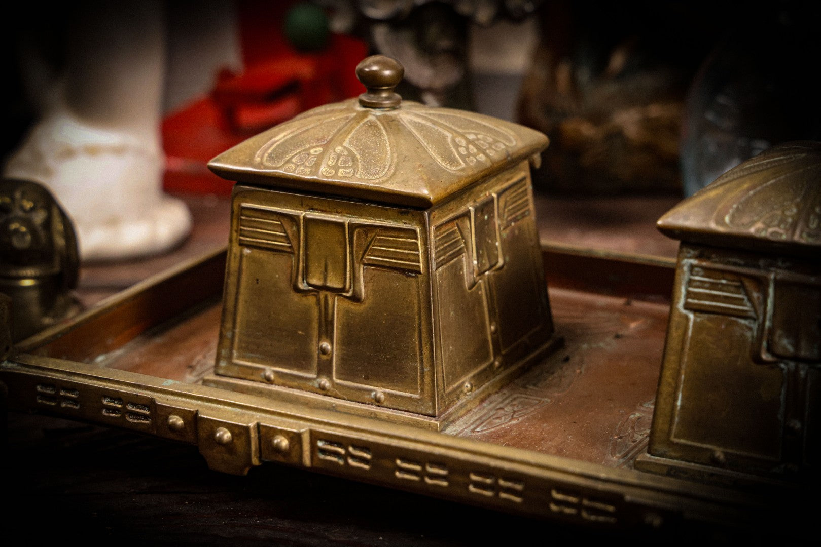 Sold For: Login to See Price Confirm BidLot 016 - Antique Arts And Crafts Art Deco Brass And Copper Double Inkwell With Hinged Lids, On[...]