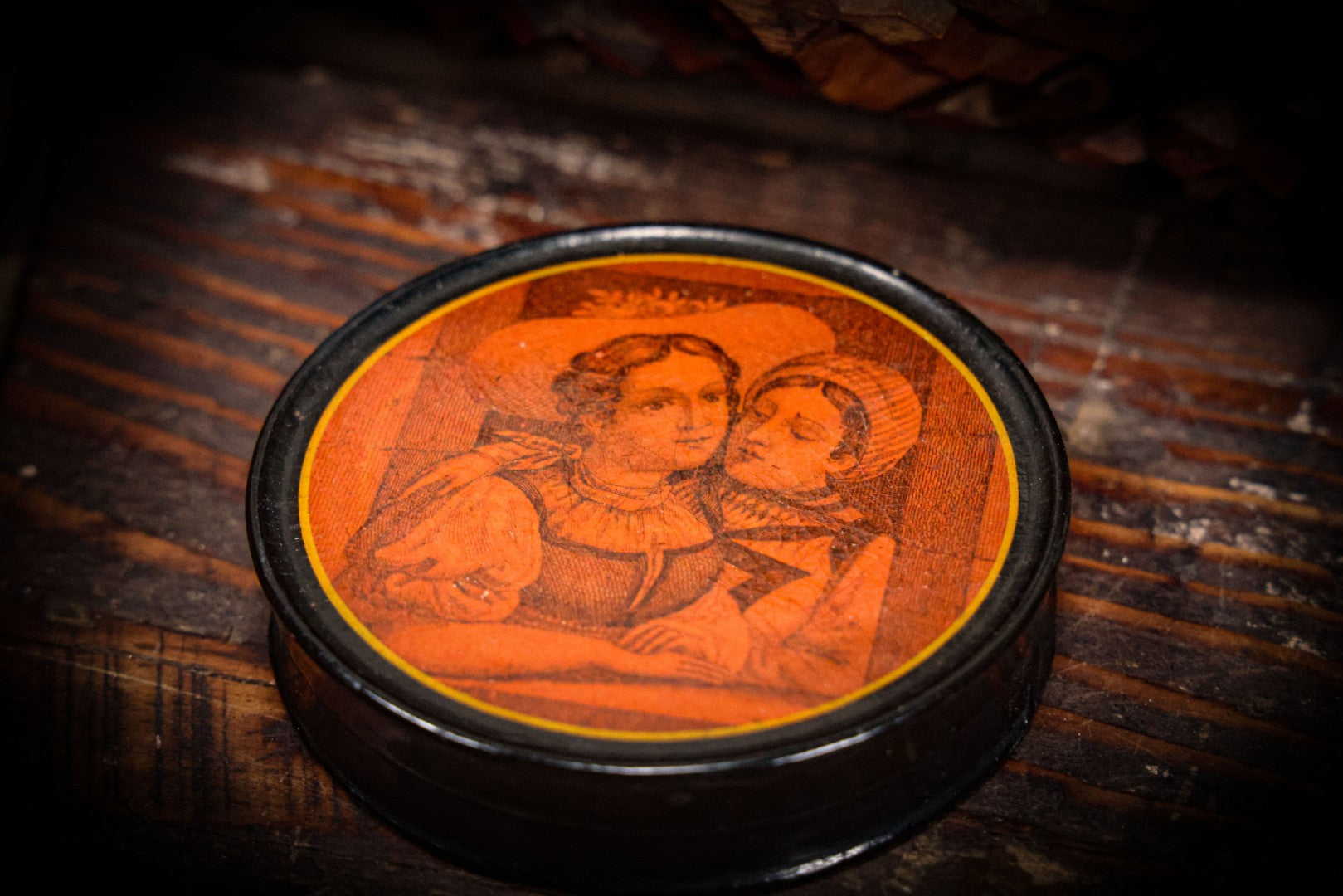 Lot 011 - Antique Laquered Papier Mache Dresser Box With Lithographed Lid Of One Woman Comforting Another, Note Small Loss To Bottom Lip