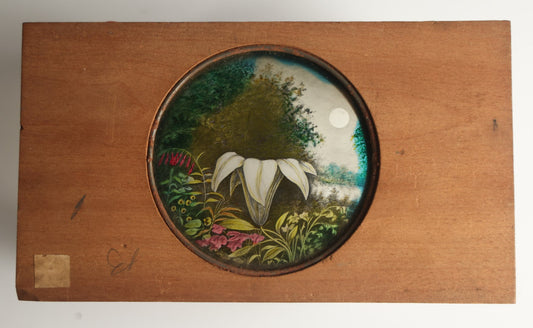 × CLOSESold outLot 044 - Antique Hand Painted Magic Lantern Slide, White Flower Among Other Foliage, Night Sky With Moon, By Pond