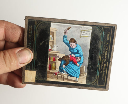 × CLOSESold outLot 046 - Antique Hand Colored Magic Lantern Slide, Boy Receiving Spanking From Mother, Note Heavy Damage And Cracking, Theo J. Harbach Manufacturer, Philadelphia, Pennsylvania