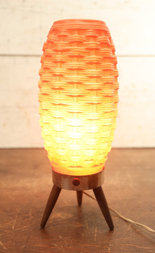 × CLOSESold outLot 049 - Vintage Mid-Century Modern Beehive Faux Basket Weave Accent Lamp, Blow Mold Plastic, Orange Color, With Three Footed Wooden Base, 13-1/2" Tall