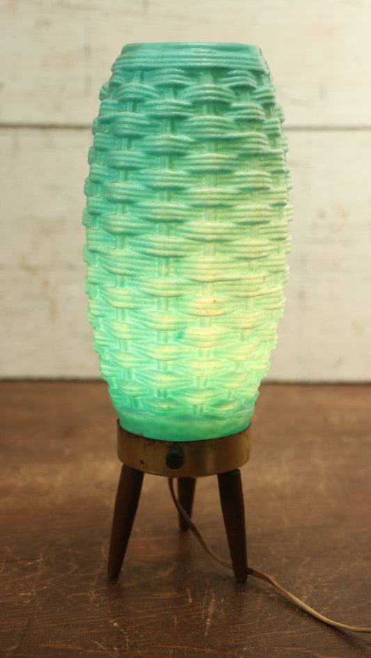 × CLOSESold outLot 050 - Vintage Mid-Century Modern Beehive Faux Basket Weave Accent Lamp, Blow Mold Plastic, Blue Teal Color, With Three Footed Wooden Base, 13-1/2" Tall