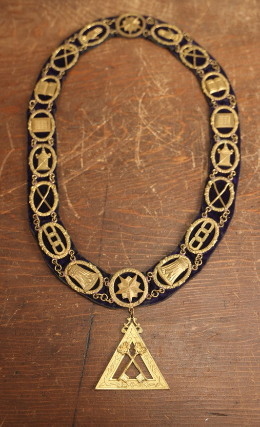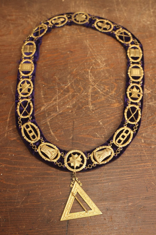 × CLOSESold outLot 055 - Antique Odd Fellows I.O.O.F. Purple Chain Collar With Many Symbols Including Three Links And Heart In Hand, With Single Staff Medallion, By Harding Uniform & Regalia Company, Boston