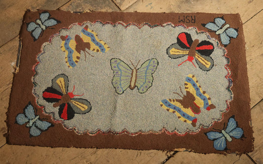 Vintage Handmade Folk Art Hooked Butterfly Rug, Artist Initialed R.S.M.